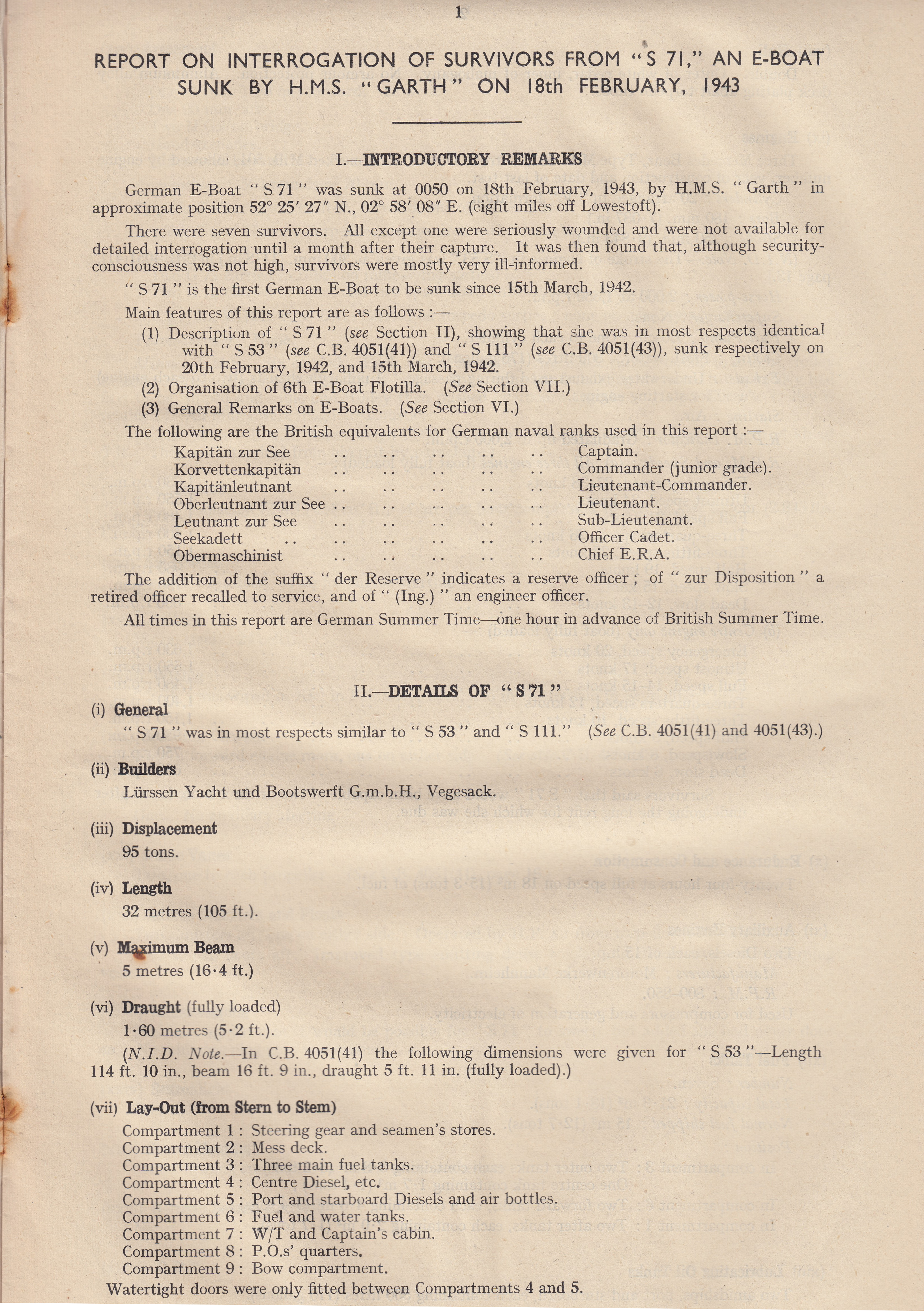 REPORT ON INTERROGATION OF SURVIVORS FROM "S 71", AN E-BOAT