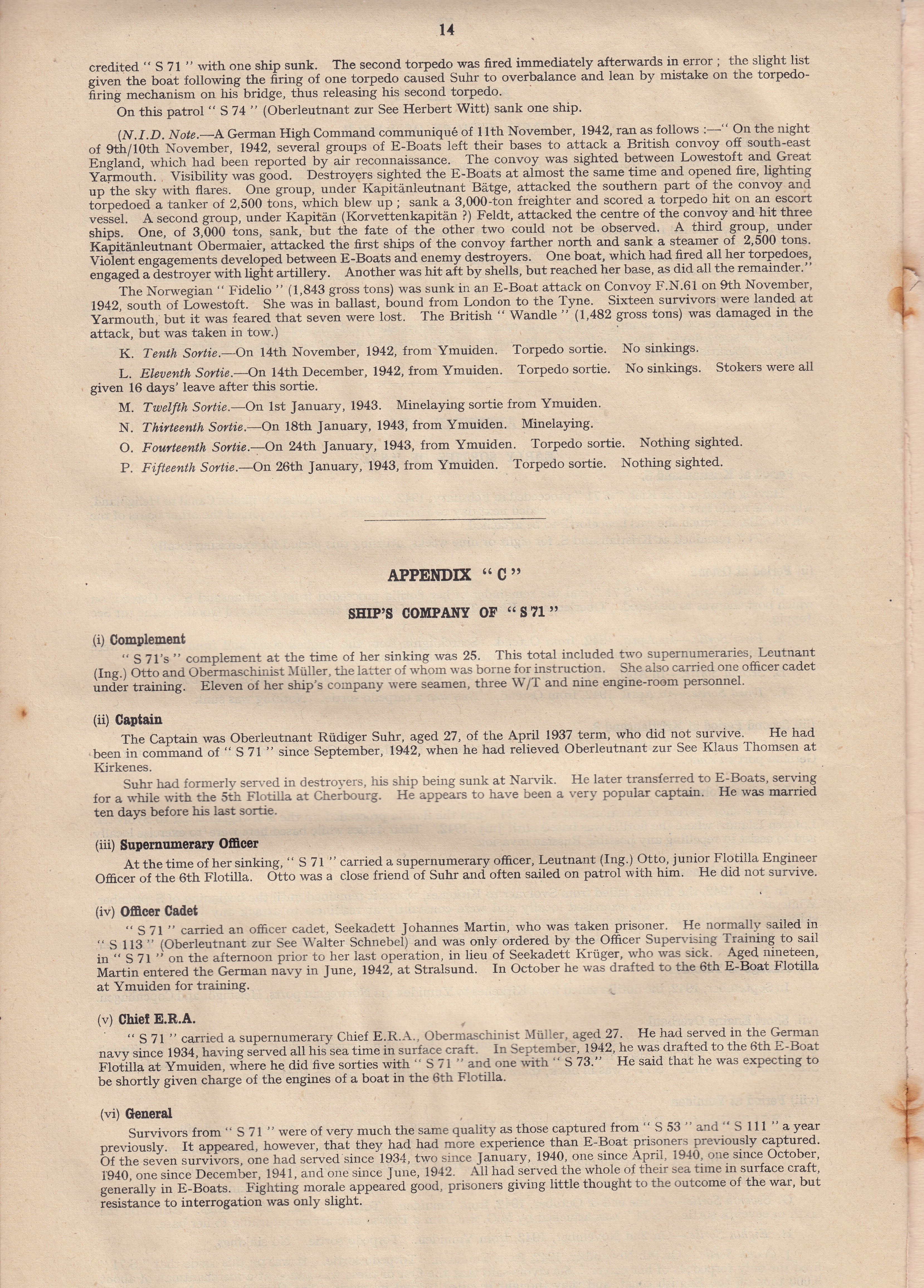 REPORT ON INTERROGATION OF SURVIVORS FROM "S 71", AN E-BOAT