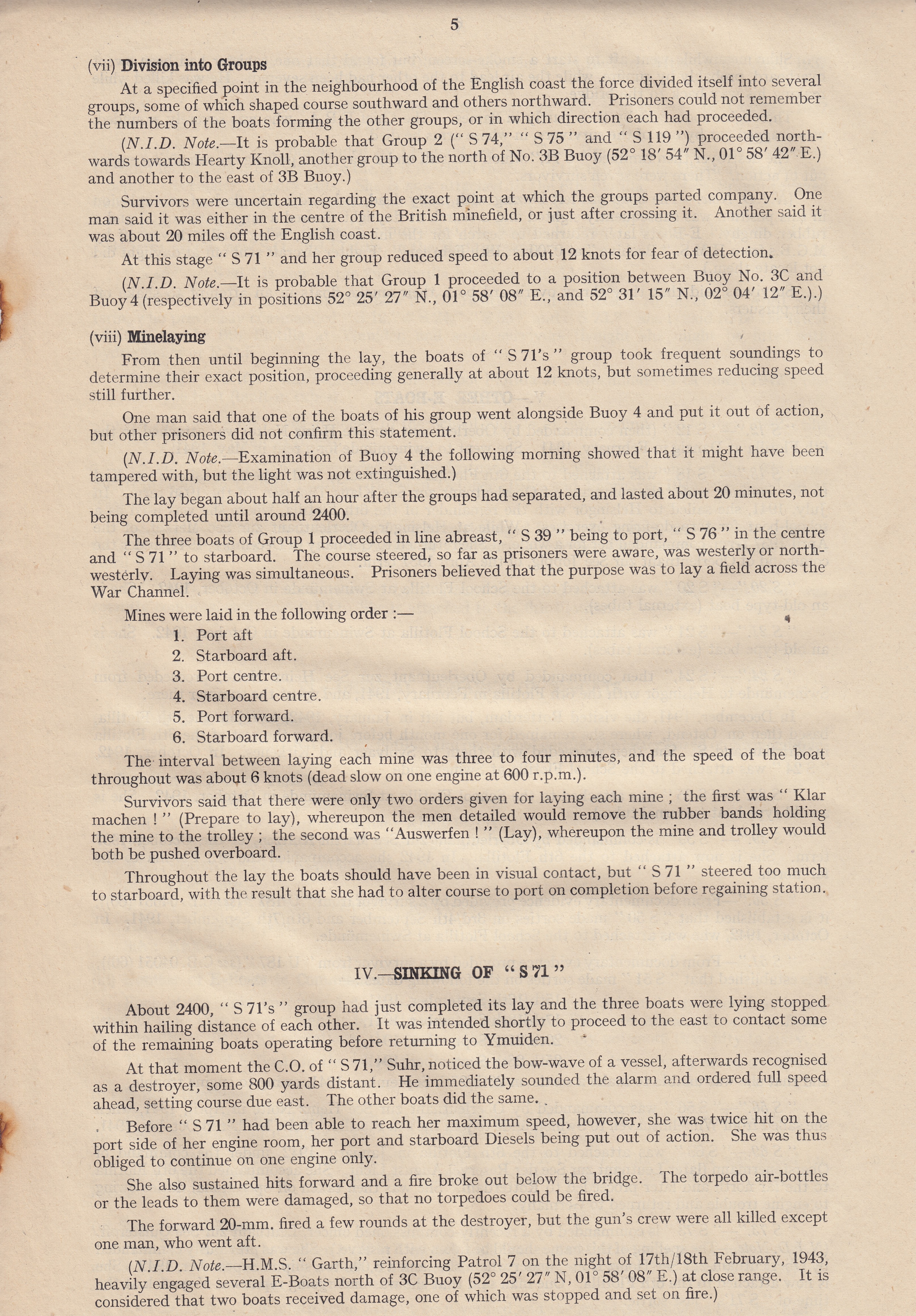 REPORT ON INTERROGATION OF SURVIVORS FROM "S 71", AN E-BOAT