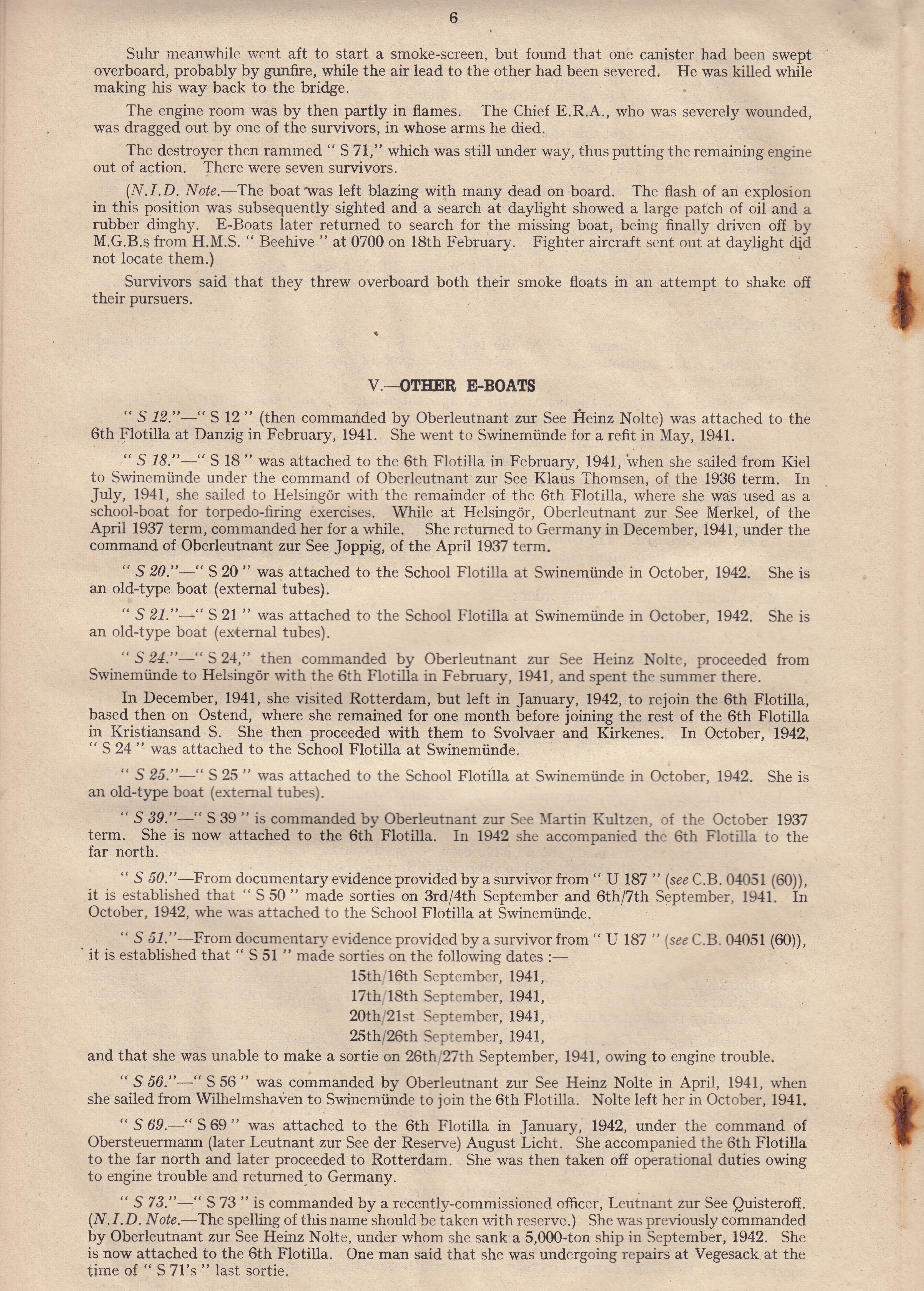 "S 91" - "S 91" is commanded now by Oberleutnant zur See Heinz Nolte, of the April 1937 term, who previously commanded "S12", "S 24", "S 56", and "S 73". She is said to be the latest addition to the 6th Flotilla at Ymuiden and some surviors thought she might be fitted with hydrophones or R.D.F.