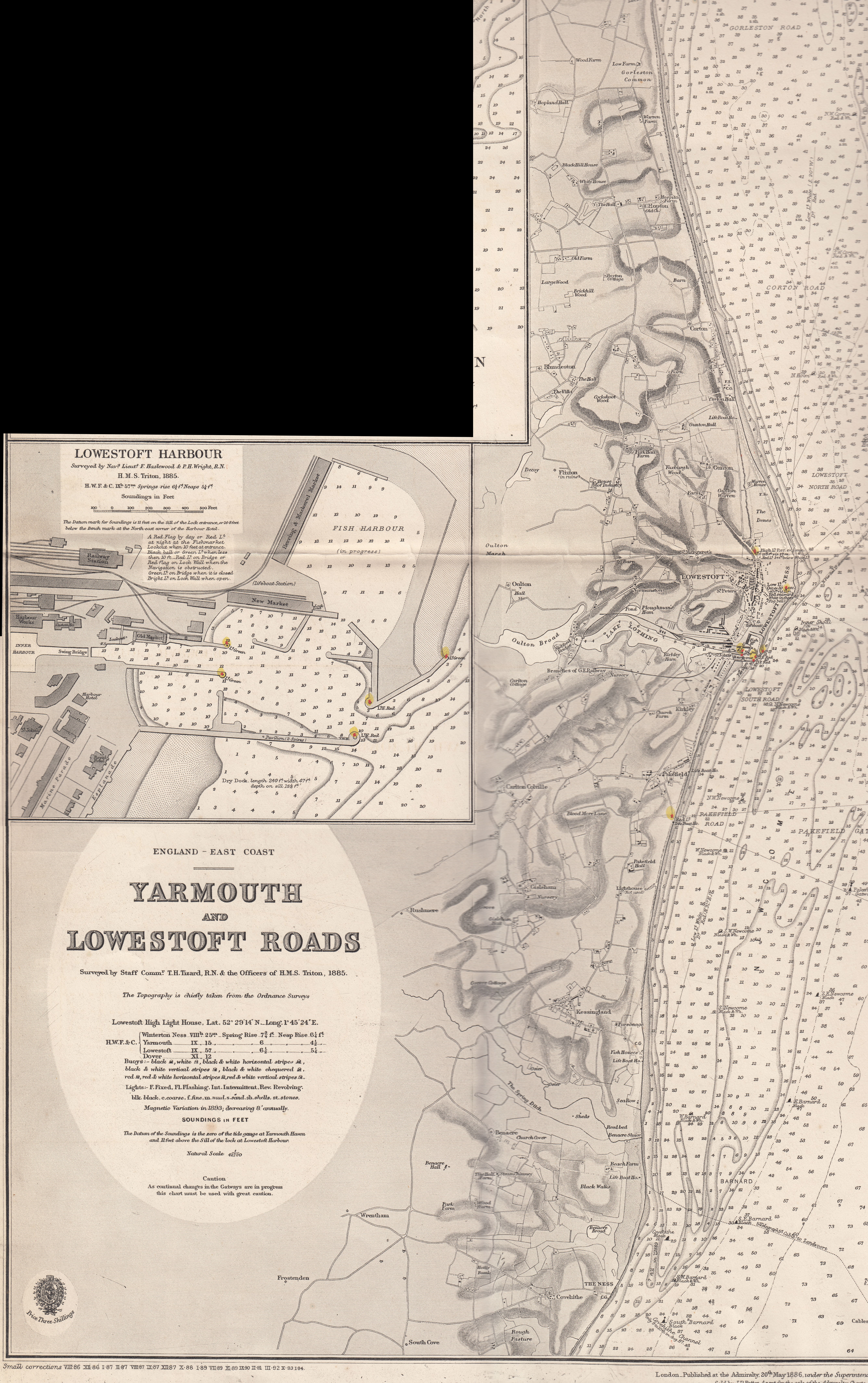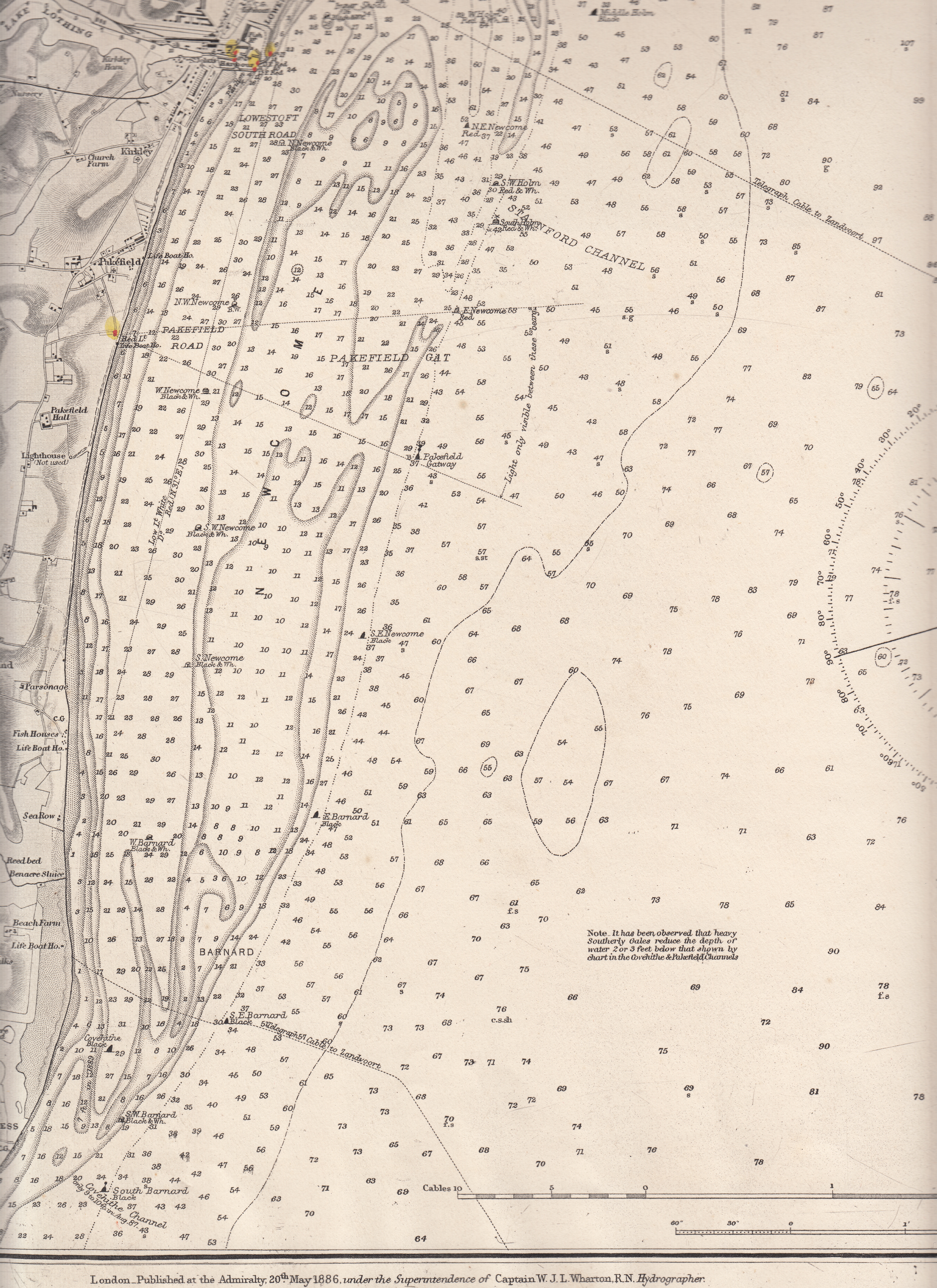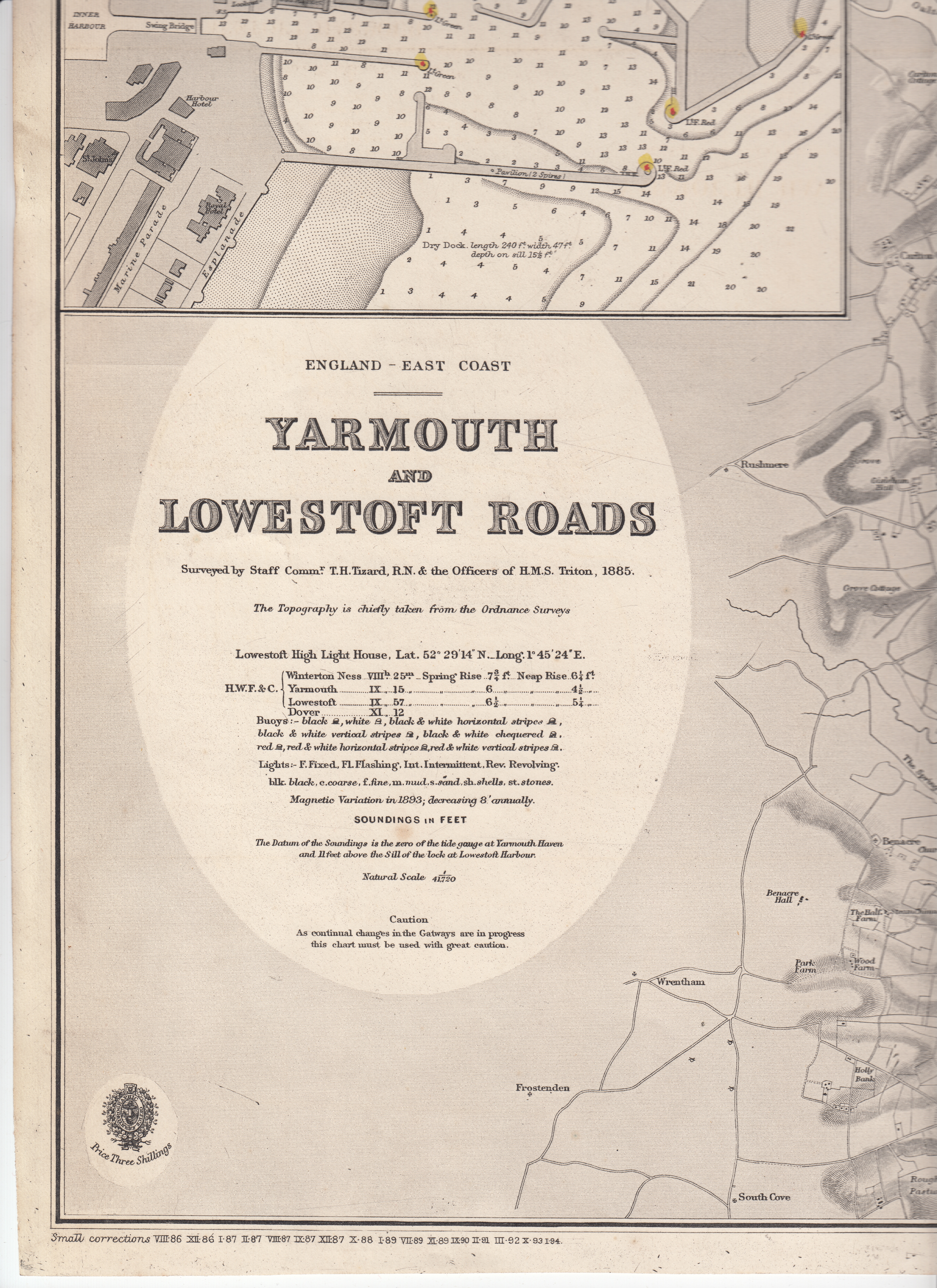 This is a massive map (at least 5' x 3') and I've scanned it into managable portions just so it will download in a reasonable time. It was used by merchant marine and fisherman in their offices because it had not only local roads and landmarks, it had detailed information on sea depths, sandbanks, harbour information, light house information, etc.