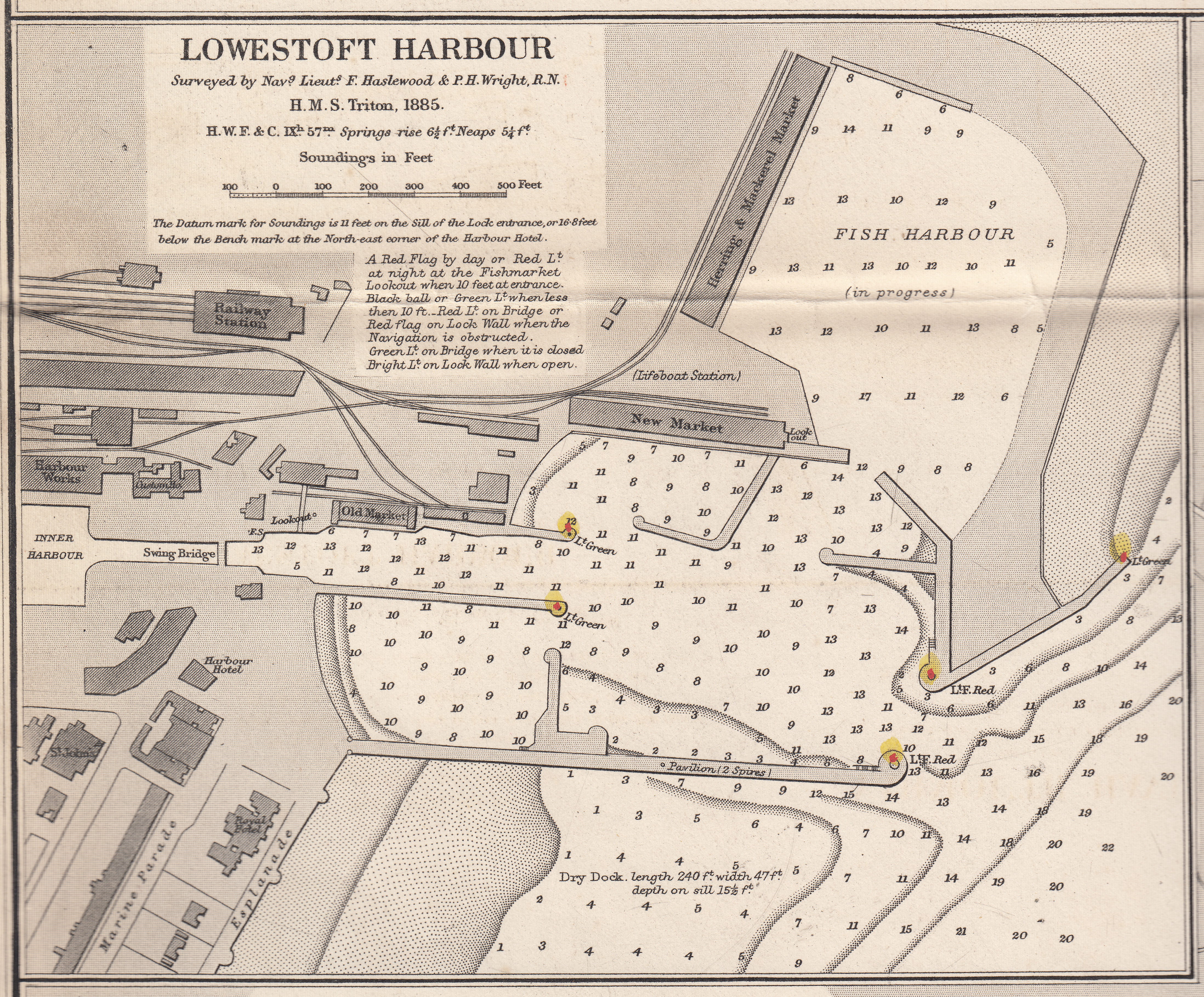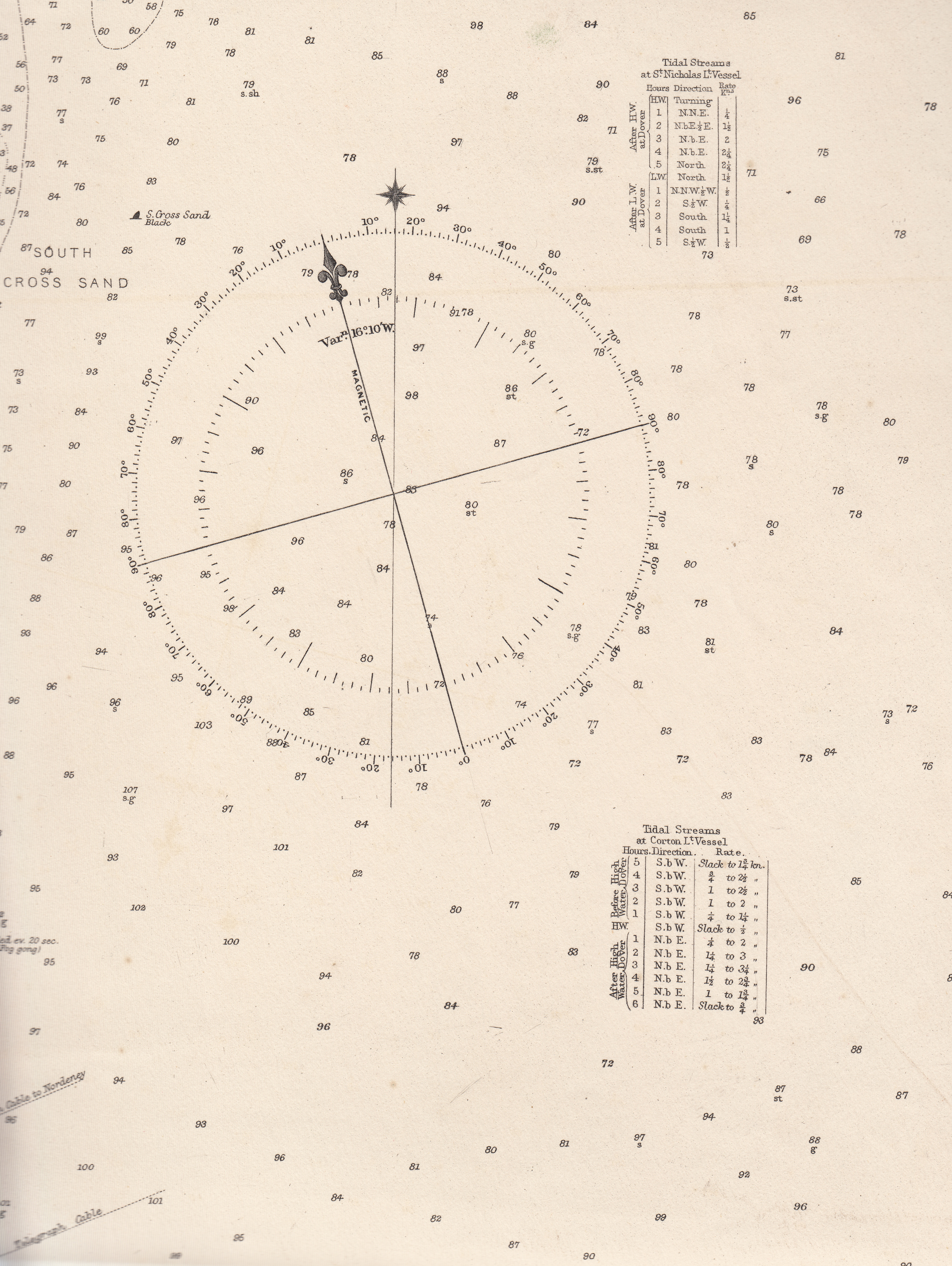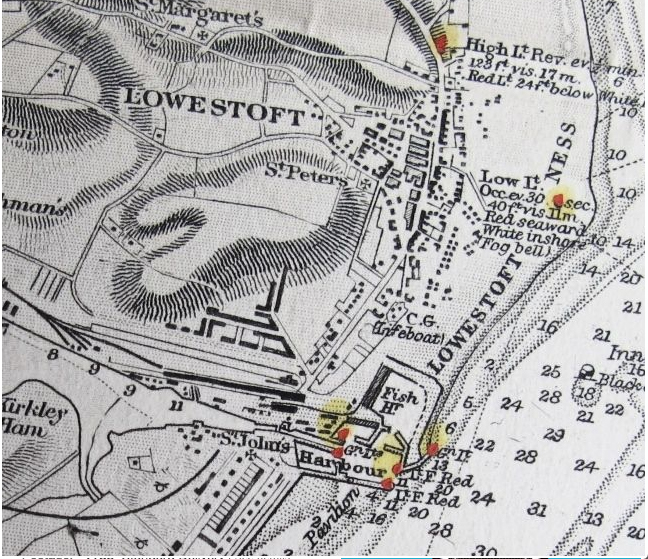 This is a massive map (at least 5' x 3') and I've scanned it into managable portions just so it will download in a reasonable time. It was used by merchant marine and fisherman in their offices because it had not only local roads and landmarks, it had detailed information on sea depths, sandbanks, harbour information, light house information, etc.