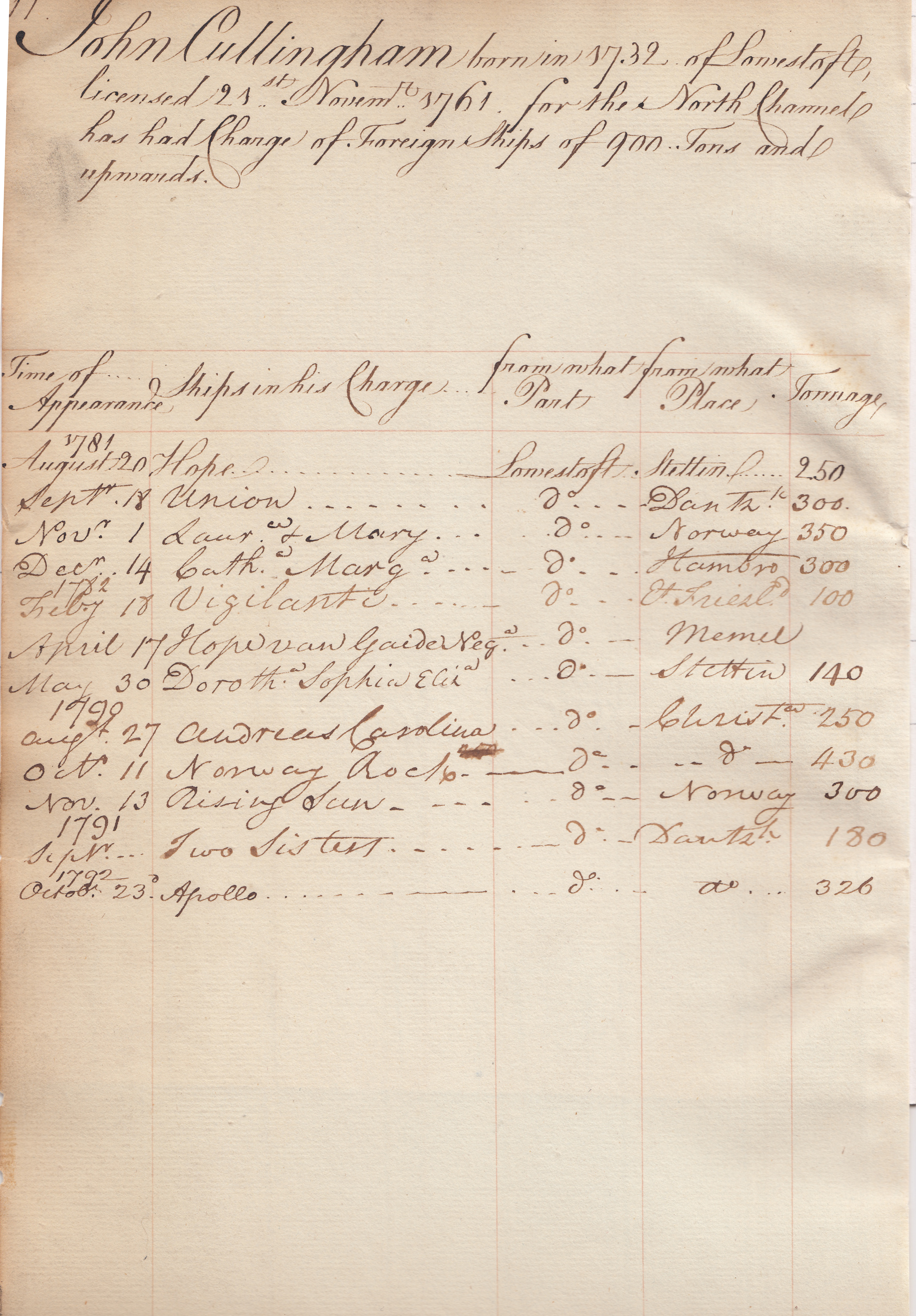 John Cullingham born in 1732 of Lowestofte licensed 21st November 1761 for the North Channels has had Charge of Foreign Ships of 900 Tons and upwards.
