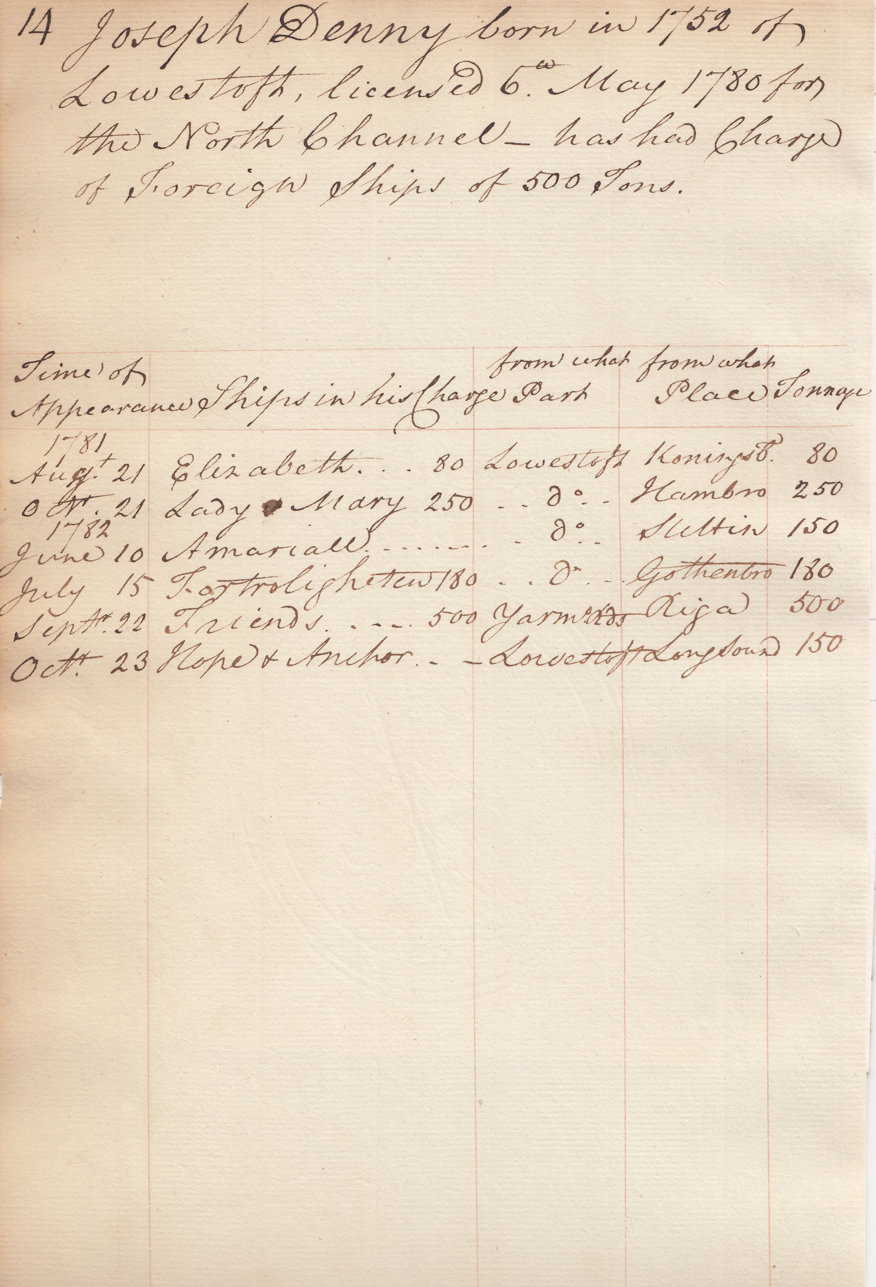 Joseph Denny born in 1752 of Lowestoft, licensed 6th May 1780 for the North Channel- has had Charge of Foreign Ships of 500 tons.