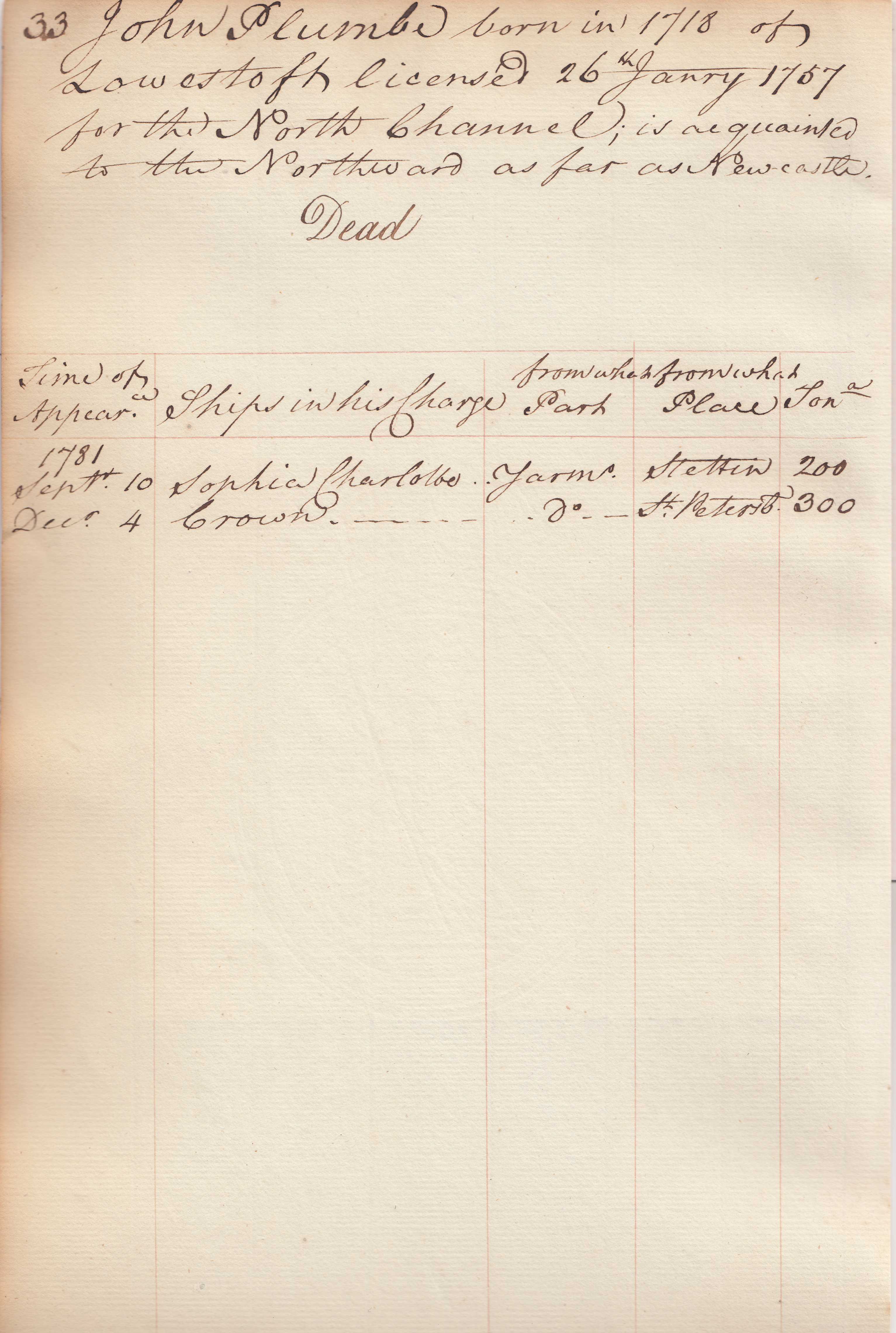 John Plumbe born in 1718 of Lowestoft licensed 26th Janry 1757 for the North Channel; is acquainted to the Northward as far as Newcastle.