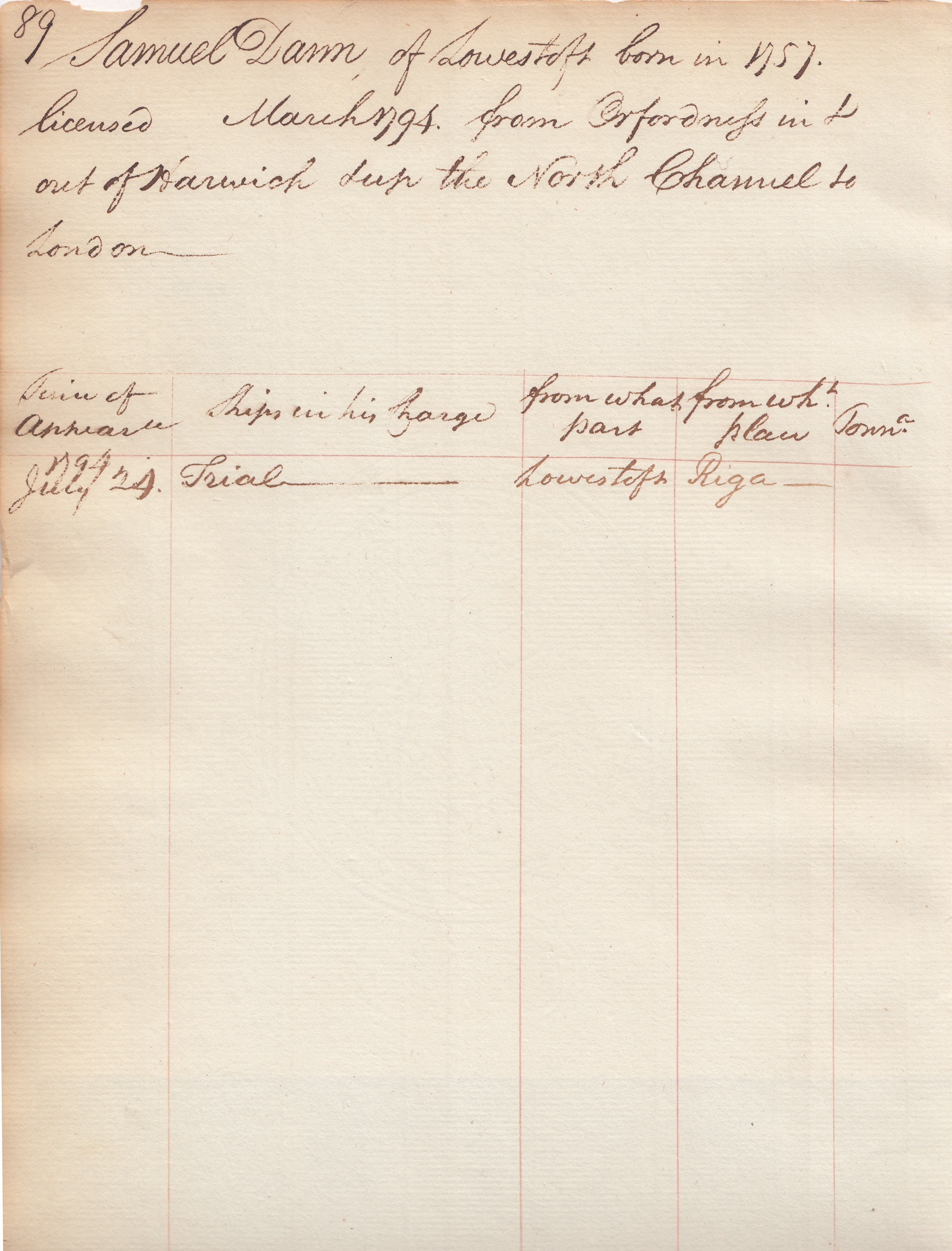 Samuel Dawn, of Lowestoft born in 1757, licensed March 1794 from Orfordness in & out of Harwich & up the North Channel to London.