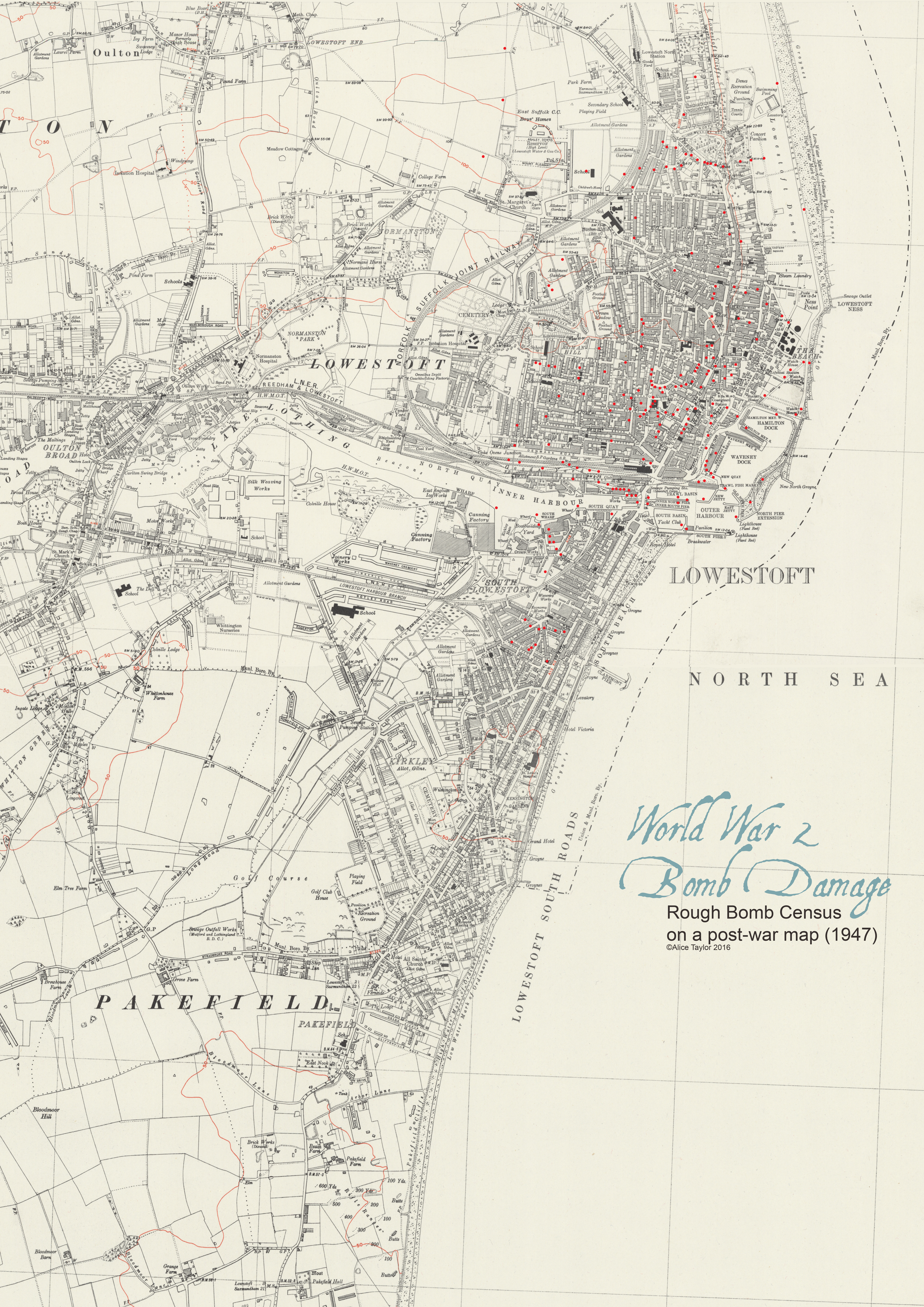 There are no complete bomb censuses of bomb damage in Lowestoft and so I am trying to create one. My goal is to have a complete and accurate census of day, time, damage report and exact loction of each impact. At the moment, information comes from scattered sources of bombing reports, some from police reports, some from military reports and some from memories, which are unfortunately rapidly fading.
